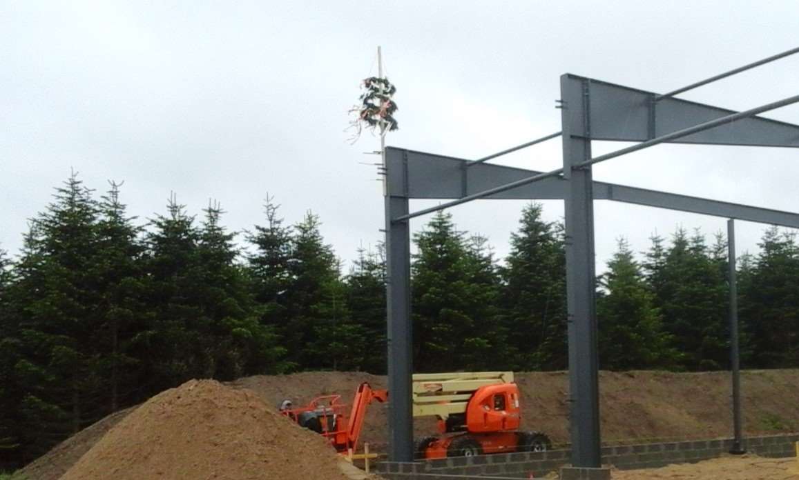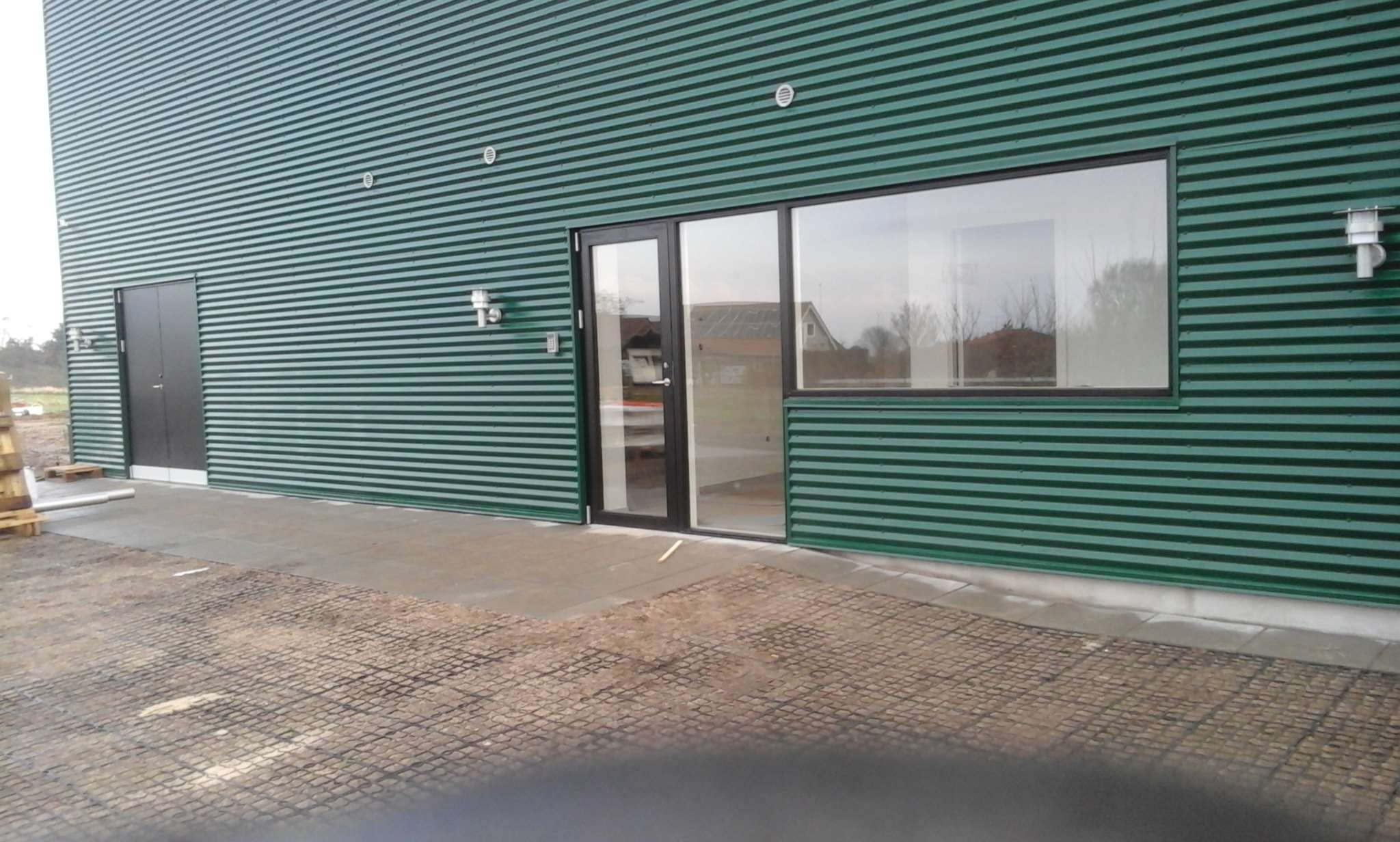Nu bliver bygningen beklædt med grønne plader, og taget afsluttes.